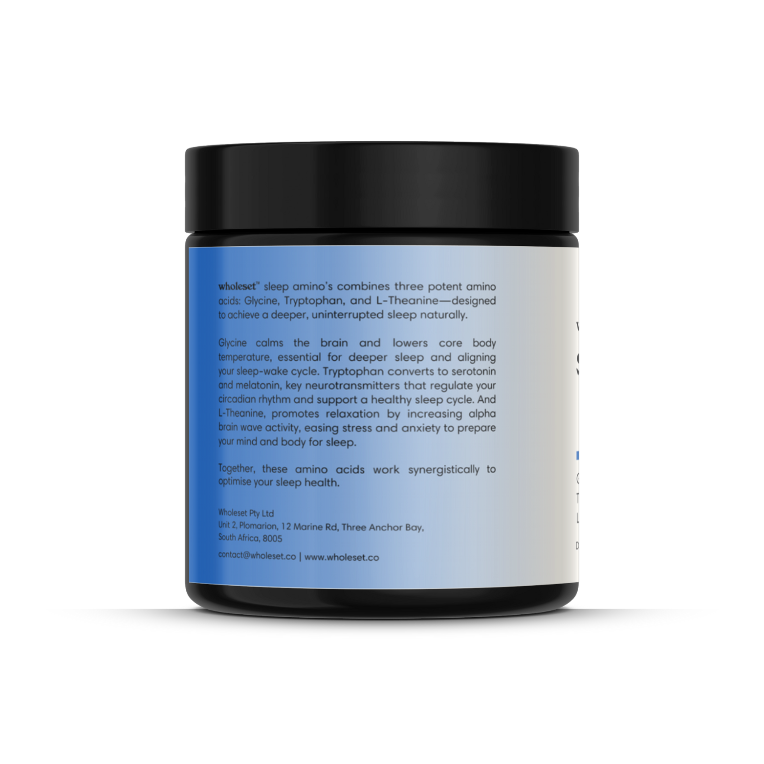 Wholeset™ Sleep Amino's is a powerful blend of three essential amino acids—Glycine, Tryptophan, and L-Theanine—formulated to help you achieve deep, uninterrupted sleep naturally. Each ingredient plays a unique role in supporting the body’s sleep cycle and overall restfulness. This supplement is designed to optimize your nightly recovery by calming the mind and body, helping you fall asleep faster and wake up feeling refreshed. Whether you struggle with occasional sleeplessness or simply want to improve the quality of your rest, this supplement offers a natural, science-backed solution for enhancing sleep health.